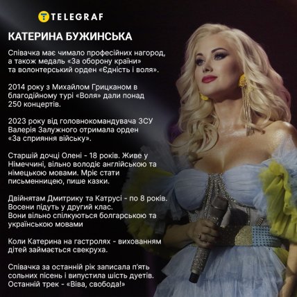 Цей рік для народної артистки України Катерини Бужинської став по-справжньому ювілейним. 13 серпня співачці виповнюється 45 років, її творча кар’єра налічує вже 25, а щасливий шлюб — 10 років. Але Катерина не планує гучні святкування та банкети — не на часі, — вона займається волонтерською діяльністю, їздить з концертами по Європі та Україною, збирає кошти для ЗСУ і виступає для нашого війська. Попри таке завантаження співачка за останній рік записала п’ять сольних пісень і випустила шість дуетів.