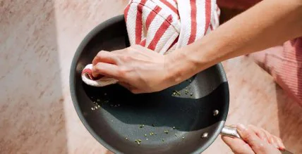 Щоб сковорідку не доводилось часто міняти, бо вона не відчищається від нагару, мийте її відразу після використання і не залишайте на ній залишки їжі. Раз на місяць можна робити легке очищення — протирати або замочувати її у содовому чи сольовому розчині. Такий простий догляд допомагає уникнути накопичення товстого шару пригорілого жиру.