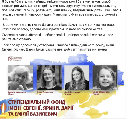 Чоловік вирішив створити Сталий стипендіальний фонд імені Євгенії, Ярини, Дарії та Емілії Базилевич. Мета цього — аби світ пам'ятав їхні імена.