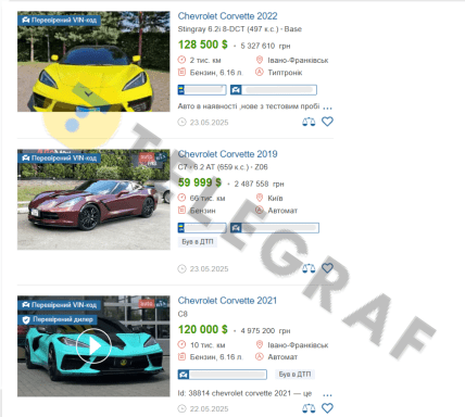 Також на сайтах купівлі-продажу наразі розміщено декілька пропозицій цієї моделі Corvette — це вживані автомобілі 2020–2022 років випуску.