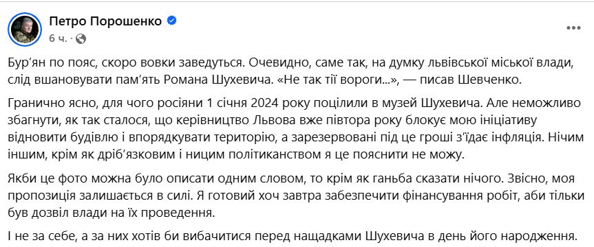 "Бур’ян по пояс, скоро вовки заведуться. Очевидно, саме так, на думку львівської міської влади, слід вшановувати пам’ять Романа Шухевича", — написав він.