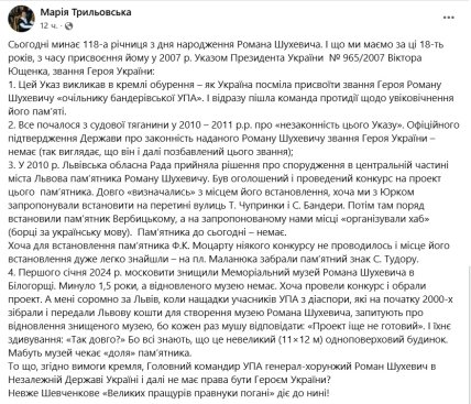 На це звернула увагу дочка Шухевича Марія Трильовська у своєму Facebook. Вона нагадала, що з моменту присвоєння її батькові звання Героя України у 2007 році, функціонування музею супроводжували численні проблеми.