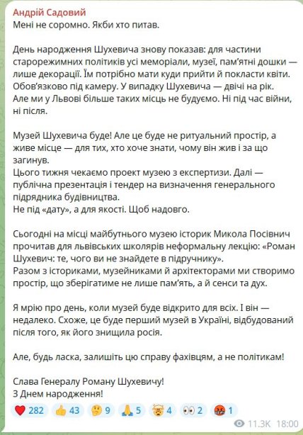 "Цього тижня чекаємо проект музею з експертизи. Далі — публічна презентація і тендер на визначення генерального підрядника будівництва. Не під "дату", а для якості. Щоб надовго", — сказав він.
