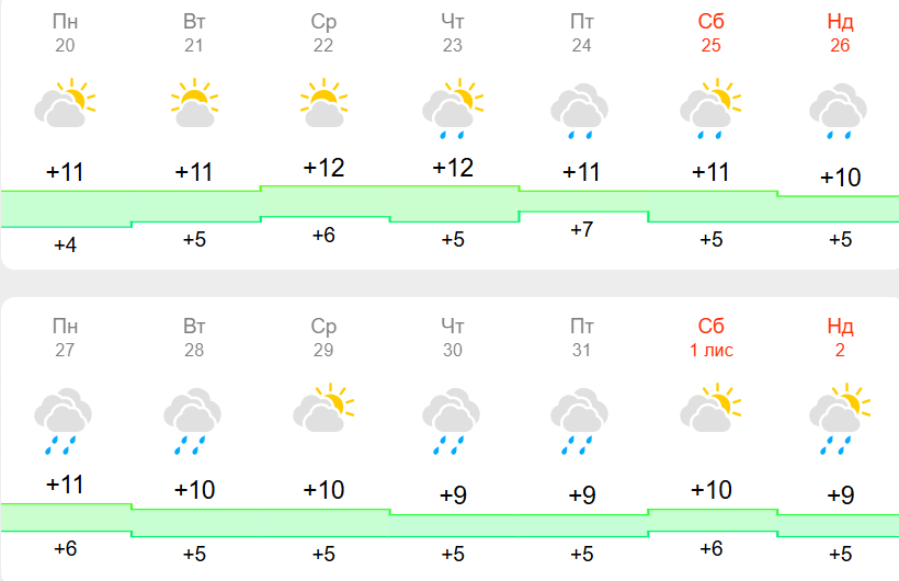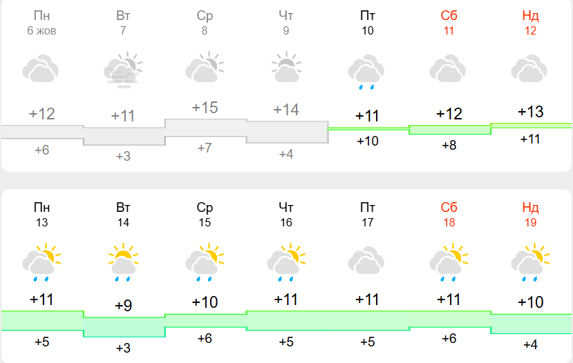 Через тиждень, у суботу, 18 жовтня, термометри покажуть +6… +11, а середньодобова температура становитиме 8,5 градуса. Ще через тиждень вночі буде +5, а вдень +11. Тож середній показник дорівнюватиме 8 градусам. 1 листопада температура повітря становитиме +6… +10. Таким чином, середній показник не зміниться. Але в деякі дні впродовж цього часу, як, наприклад 14 жовтня, він падатиме навіть до 6 градусів.
