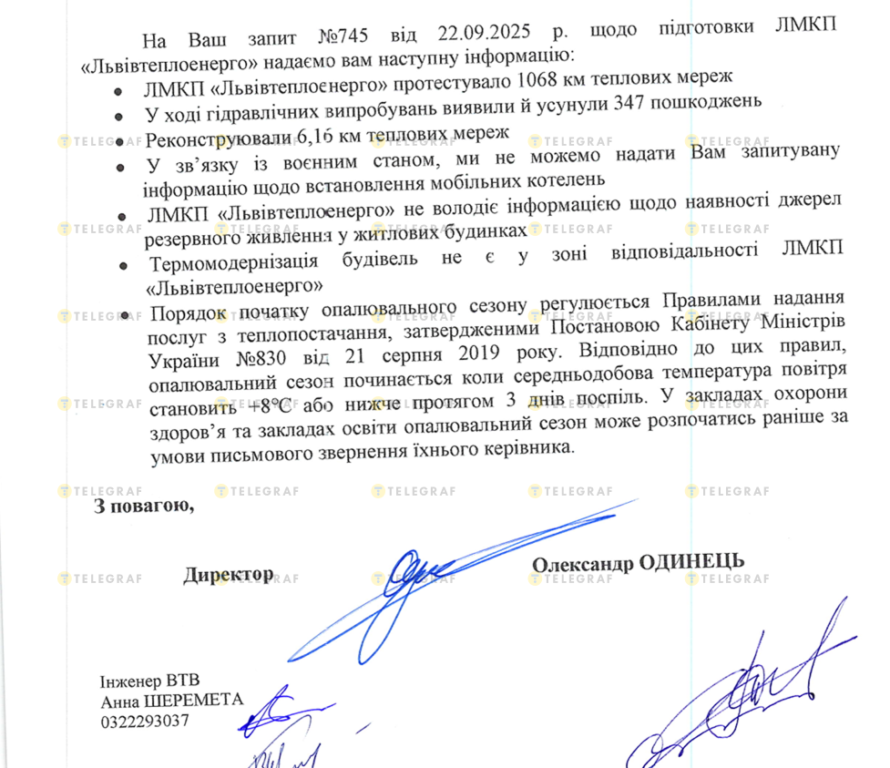 На запит "Телеграфу" до міської ради Львова, чиновники зазначили, що у Львові протестовано 1068 теплових мереж, реконструйовано 6,16 км, усунено 347 пошкоджень після тестування. Щоправда, не у віданні "Львівтеплоенерго" наявність резервного живлення та й про мобільні котельні відповідати відмовились, посилаючись на воєнний стан.