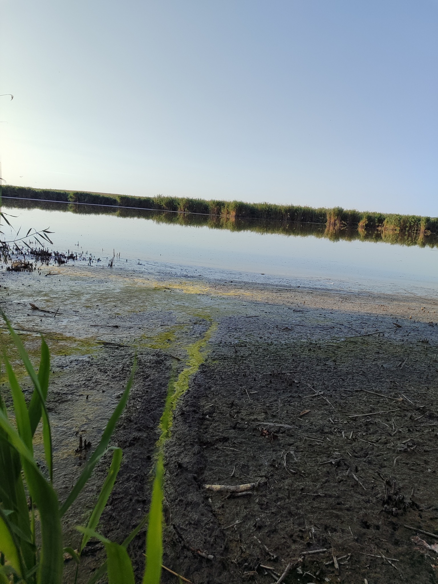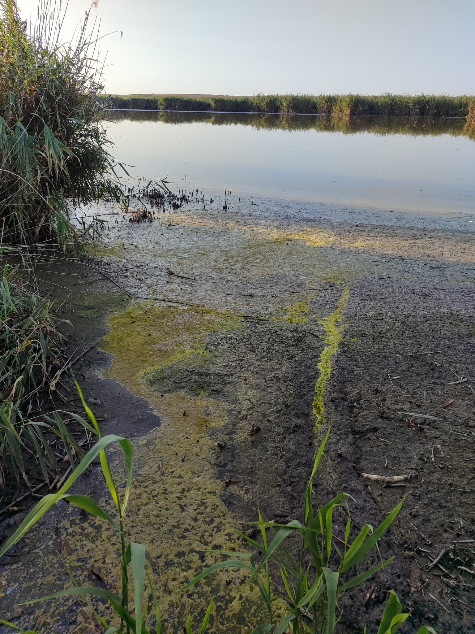 Береги поступово заростають очеретом та іншою рослинністю. У деяких мілких ділянках помітні зелені плями водоростей і цвітіння.