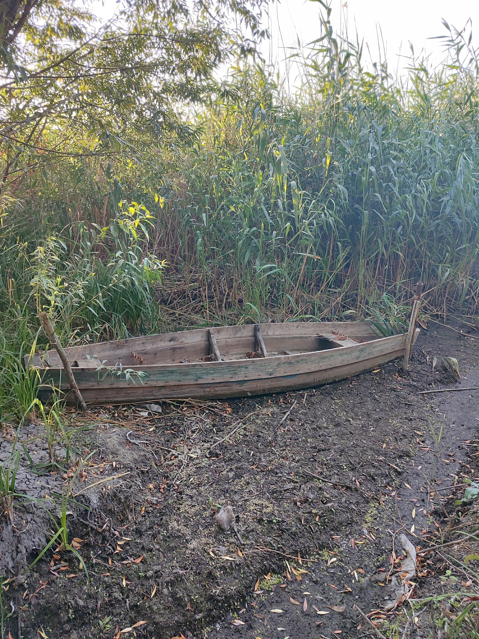Рівень води впав настільки, що її поверхня опинилася значно нижче звичного рівня, залишивши по берегах темні сліди вологого ґрунту. На суші, де колись була прибережна зона, порожніє старий дерев'яний човен.