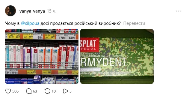 Своє обурення висловили користувачі соціальної мережі Threads. Так, один із користувачів опублікував пост, де поставив питання про те, чому в мережі супермаркетів "Сільпо" досі продається товар російського виробника. Йдеться про зубну пасту бренду "Splat".