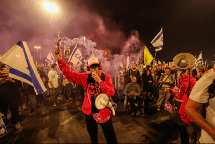 В ізраїльському Єрусалимі 31 березня понад 100 тисяч осіб влаштували мітинг біля будівлі парламенту – Кнесета – з вимогою провести дострокові вибори в Ізраїлі та негайно укласти з терористами з ХАМАС угоду щодо звільнення заручників. Акція протесту супроводжується розпаленням багать, перекриттям доріг та сутичками з поліцією, яка використовує водомети.