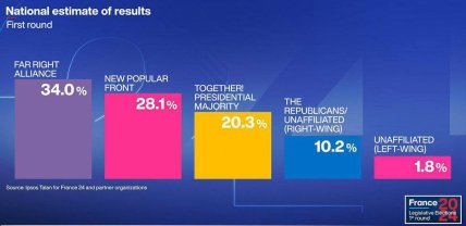 Нагадаємо, що на початку червня президент Франції Еммануель Макрон, стикнувшись з нищівною поразкою своєї партії на виборах до Європейського парламенту, пішов на відчайдушний крок: розпустив Національні збори та призначив позачергові вибори.