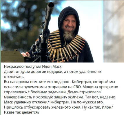 "Дарує від душі дорогі подарунки, а потім віддалено їх відключає. Ви напевно пам’ятаєте його подарунок — Кібертрак, який ми оснастили кулеметом і відправили на СВО... Так от, нещодавно Маск віддалено відключив кібертрак. Не по-чоловічому це. Довелося відбуксирувати залізного коня. Ну як так, Ілон? Хіба так робиться?", — написал Кадиров.