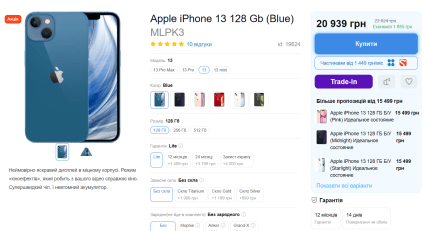 Отже, найдешевшим, станом на 10 квітня 2025 року, є iPhone 13 на 128 ГБ пам’яті в синьому кольорі. Його ціна становить 20 939 гривень. За чорний чи червоний вартість буде вищою щонайменше на 1 000 гривень.