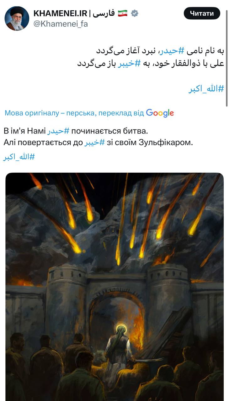 Тим часом в українському та російському сегментах мережі з’явилися повідомлення про те, що на іранському державному телебаченні нібито попередили про те, що "ввечері буде сюрприз, який світ запам’ятає на віки". Верховний лідер Ірану Алі Хаменеї у своєму X при цьому написав, що "битва починається".