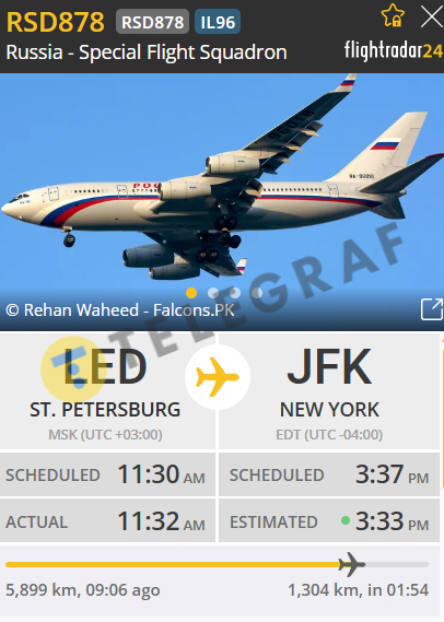 Борт вирушив із Санкт-Петербурга (аеропорт Пулково) близько 11:30 за московським часом та, згідно з останніми оновленнями, має прибути до Міжнародного аеропорту ім. Джона Кеннеді в Нью-Йорку (JFK/KJFK) о 15:34 за місцевим часом.