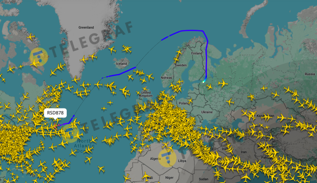 Про це свідчать дані FlightRadar24. Йдеться про спеціальний авіаборт із реєстраційним номером RSD878/Іл-96.