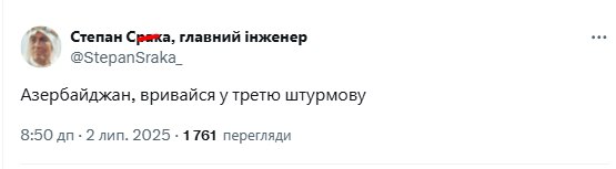 Четвертий мем — короткий і лаконічний напис "Азербайджан, вривайся в третю штурмову", що іронічно натякає на військову риторику і "бойовий дух" українців.