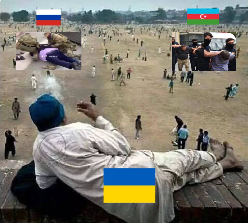 На іншому фото зображений увесь конфлікт між Росією та Азербайджаном на тлі масових затримань, де за всіма новинами спостерігає Україна.