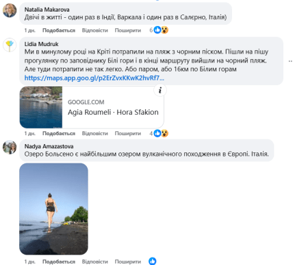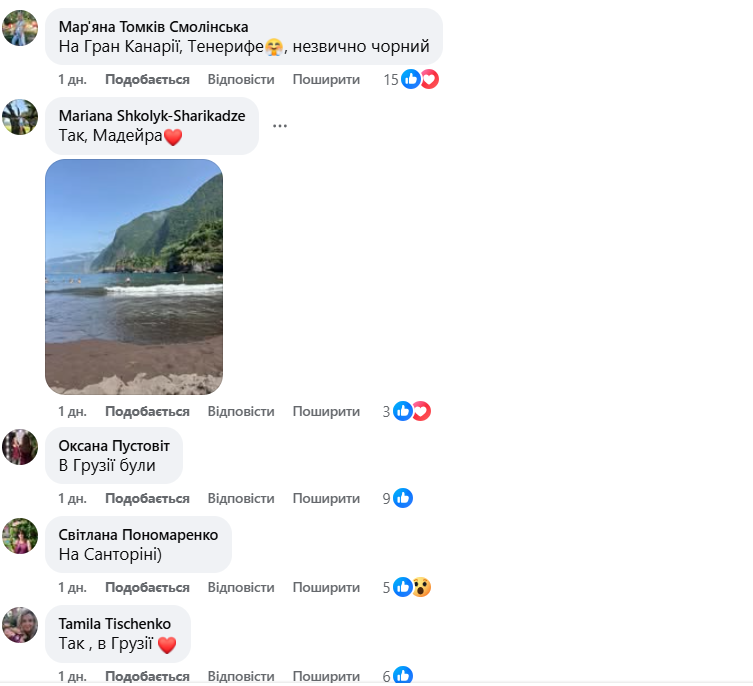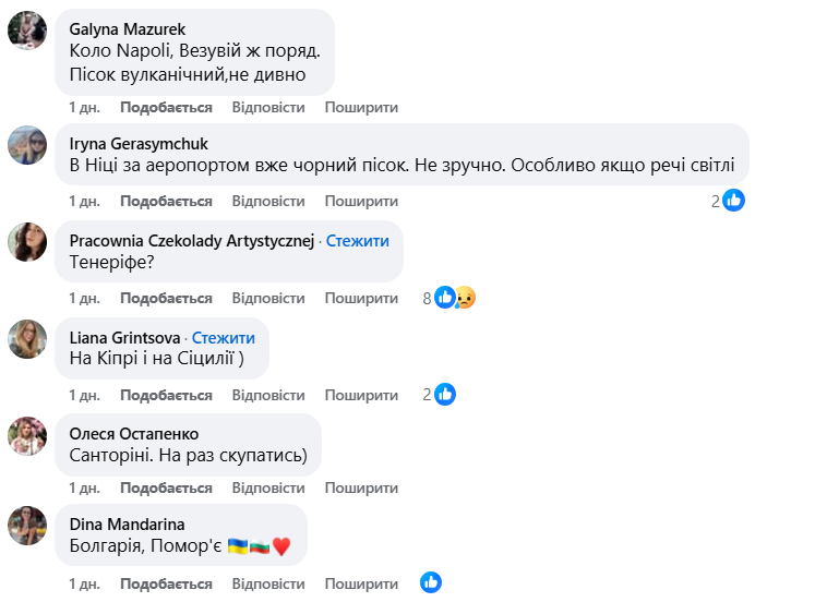 Серед інших популярних локацій — острів Мадейра, Тенеріфе, Санторіні, Крит, Неаполь, а також курорти Грузії. У коментарях згадали навіть озеро Больсено — найбільше вулканічне озеро Європи, розташоване в Італії. Дехто з українців натрапив на чорний пісок і в Індії, й на Кіпрі, й навіть за аеропортом у французькій Ніцці.