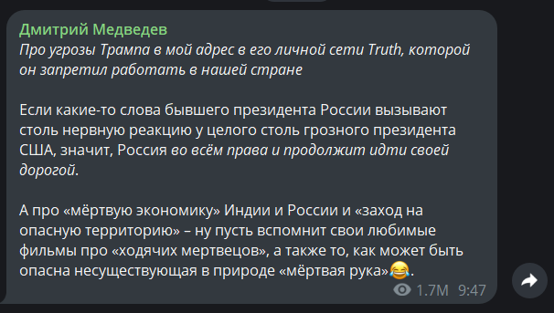 Паніки чи збентеження в заявах російських чиновників, яких просять прокоментувати дедлайн Трампа, немає. Разом з тим, голова уряду РФ та колишній президент країни Дмитро Медвєдєв вже встиг пригрозити США війною та розпочати дистанційну дискусію з Марко Рубіо, який відкрито висміяв спроби соратника Путіна залякати світ ядерною війною.