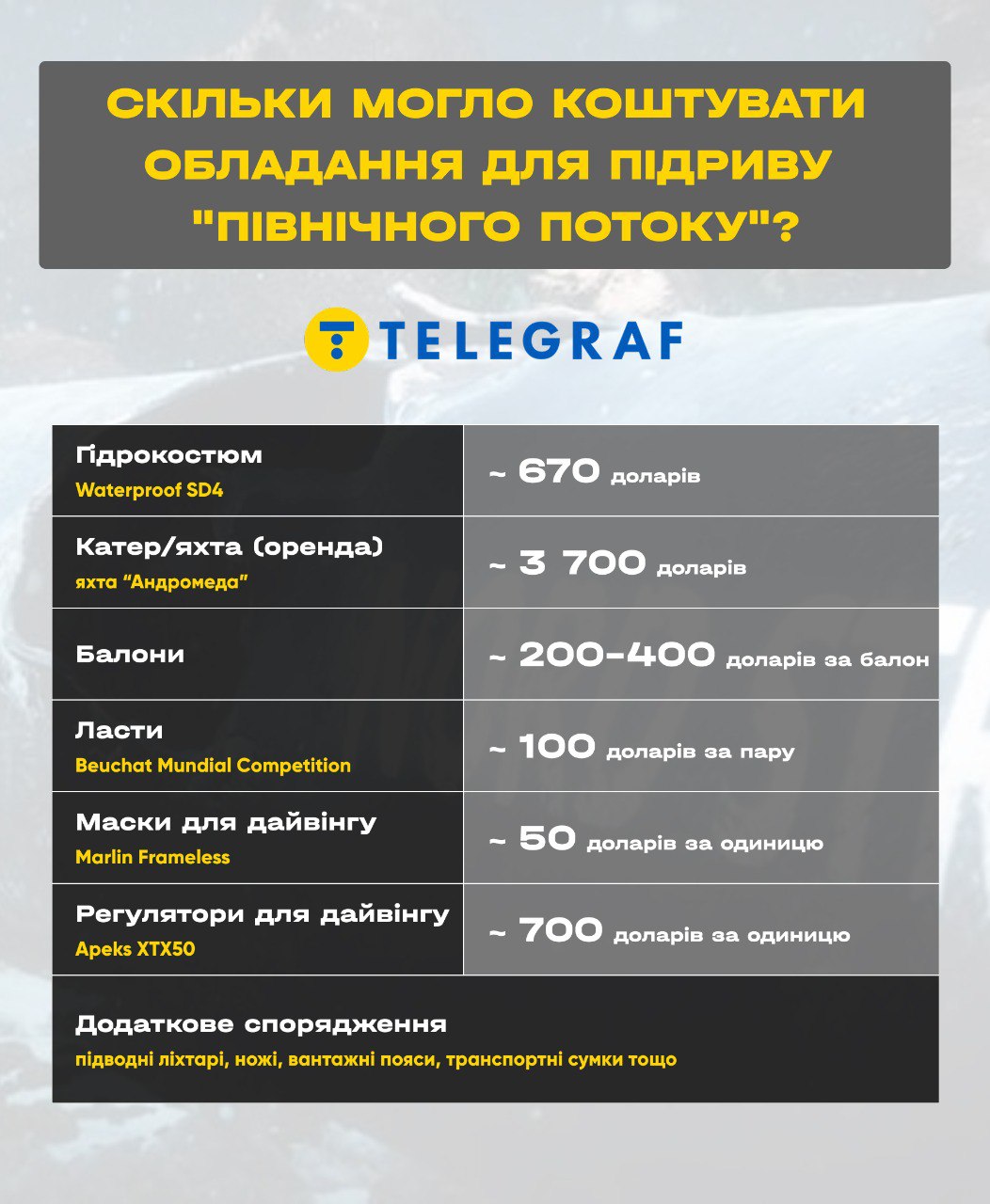 Військовий оглядач Олег Старіков в коментарі "Телеграфу" заявив, що вважає: диверсія на "Північних потоках" могла коштувати близько мільйона доларів. Він пояснює: витрати включали оренду яхти, спорядження для водолазів, вибухівку, логістику та оплату команди.