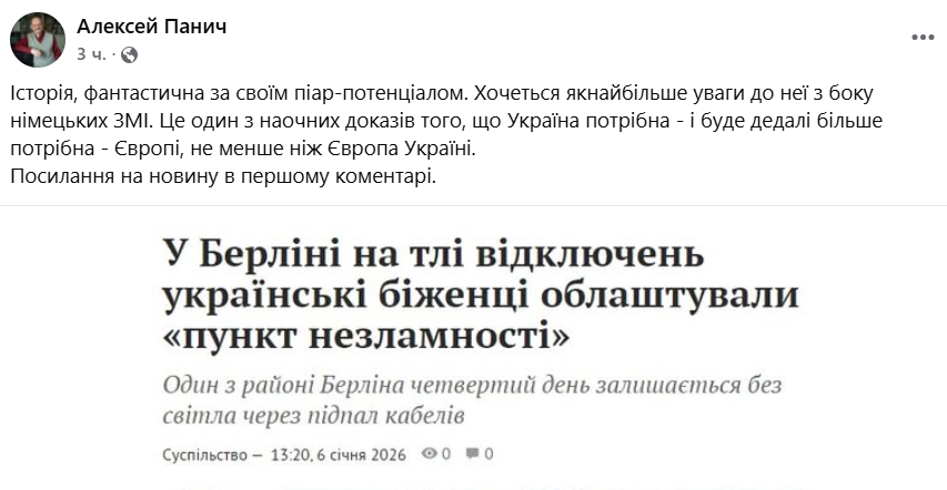 Українські біженці в Берліні відкрили для місцевих жителів "пункт незламності", де під час тривалого блекауту можна зігрітися та зарядити гаджети. Один із районів міста вже четверту добу залишається без світла через підпал кабелів на електростанції.