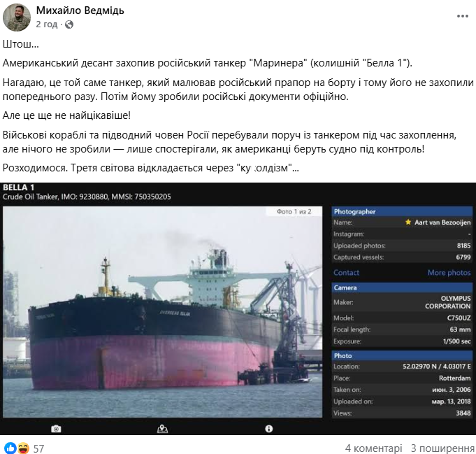 "Це той же танкер, який перевозив підсанкційну нафту до Венесуели й намагався замаскуватися під російським триколором. Можуть, коли захочуть!", — говорить він.