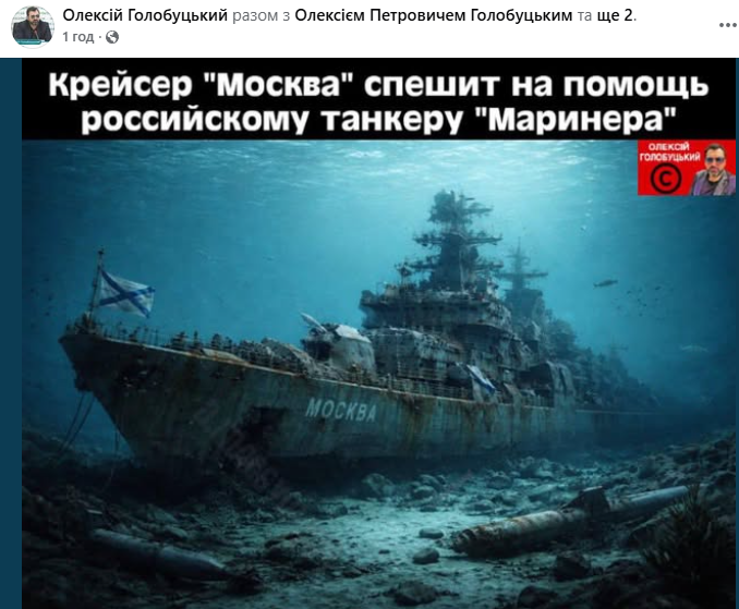 "Крейсер Москва поспішає на допомогу російському танкеру "Маринера", — зазначив він у підписі під картинкою.