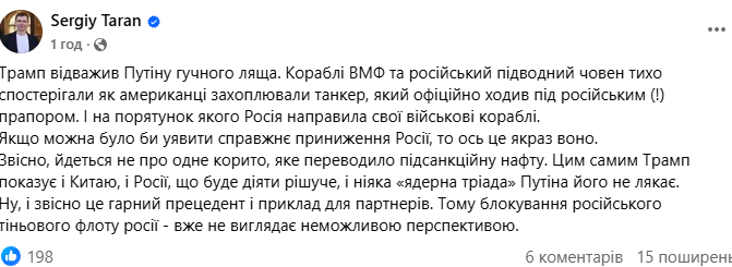"Американці таки захопили танкер російського тіньового флоту Марінера, який намагався втекти від Берегової охорони США з карибського моря аж до Мурманська. У момент захоплення поряд там знаходилися кораблі російського військово-морського флоту, включаючи підводнийу човен, але з якихось причин вони втручатися не стали", — зазначив він.
