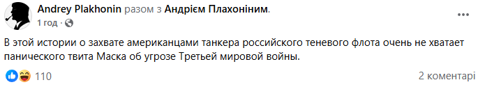 "Військові кораблі і підводний човен Росії знаходилися поряд з танкером під час захоплення, але нічого не зробили — тільки спостерігали, як американці беруть судно під контроль Розходимося. Третя світова відкладається", — говорить він.