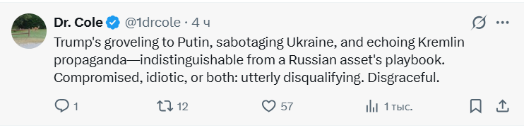 "Підхалимство Трампа перед Путіним, саботаж України та повторення кремлівської пропаганди — неможна відрізнити від тактики російського агента. Компрометація, ідіотизм чи й те, й інше: абсолютно дискваліфікує. Ганьба", — написав інший коментатор.