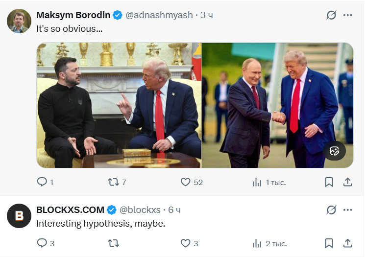 Один із користувачів опублікував фото лютневої зустрічі Трампа з президентом України Володимиром Зеленським в Овальному кабінеті з написом "Це аб’юз". Для порівняння тут же розмістили зображення дружнього рукостискання американського лідера з главою Росії Володимиром Путіним.
