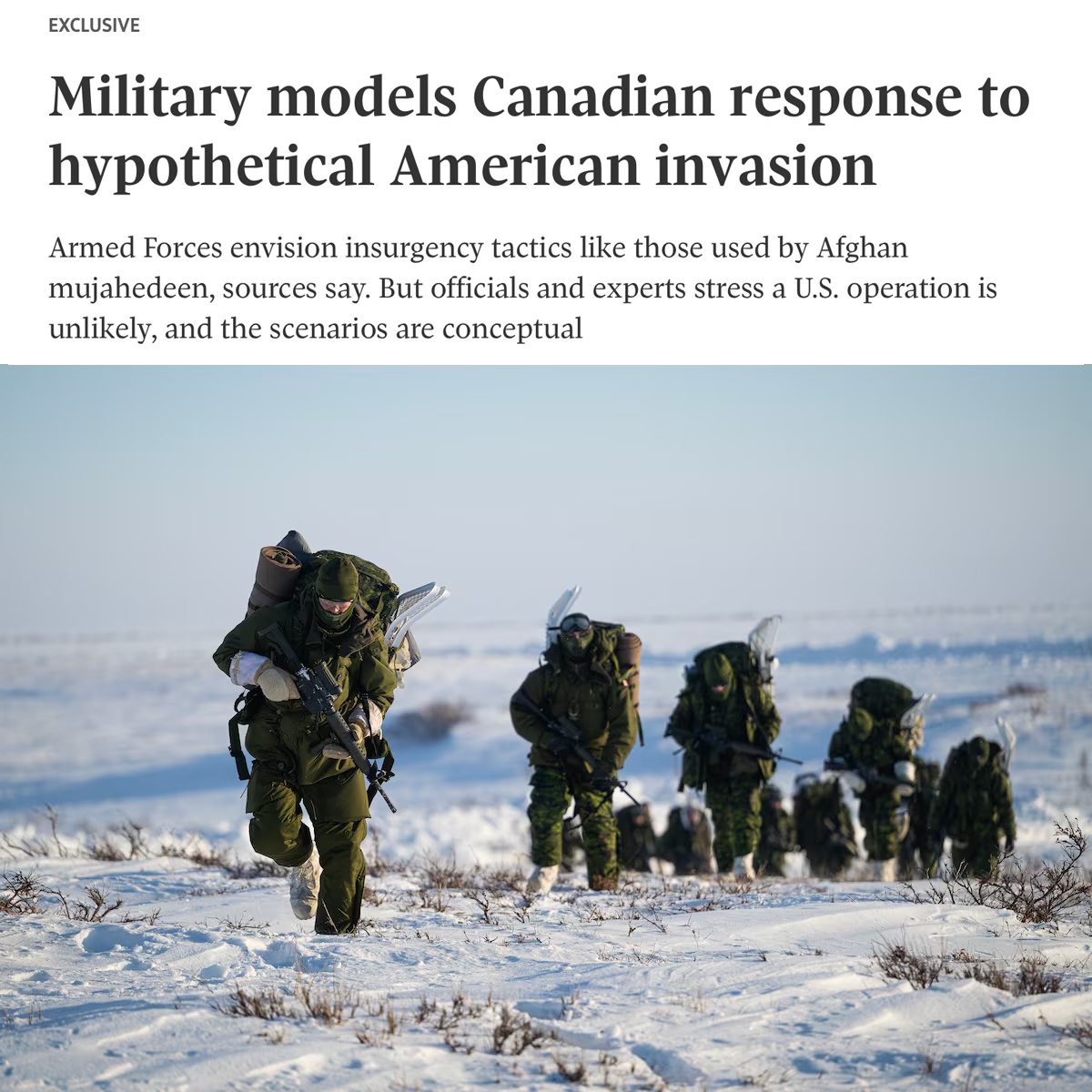Також, канадські військові виходять із того, що вторгненню передував би розрив співпраці в рамках NORAD — ключової системи спільної протиповітряної оборони. Після цього Канада мала б не більше трьох місяців на підготовку. Призов до армії поки що виключається, але розглядається створення масштабного резерву добровольців чисельністю понад 400 тисяч осіб, включаючи їхню можливу участь у партизанських діях на окупованій території.