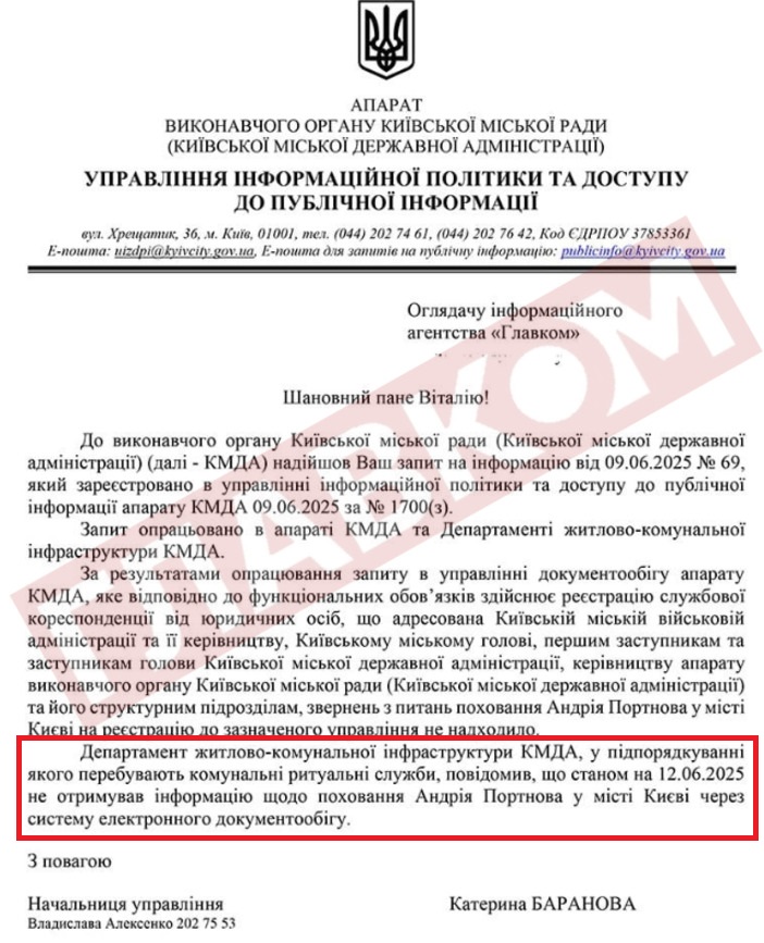 Відповідь КМДА щодо поховання Портнова. Скріншот "Главкому"