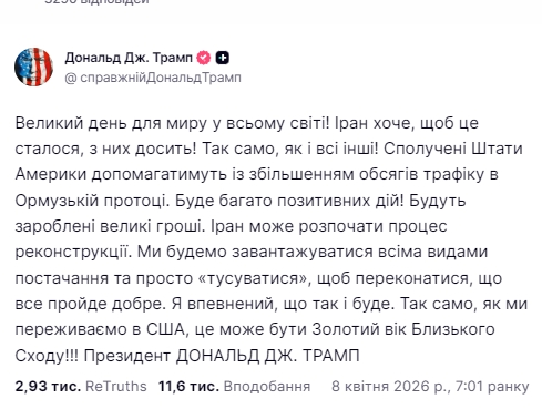 Є повідомлення про те, що Іран стягує плату з танкерів, які проходять через Ормузьку протоку — їм краще цього не робити, а якщо роблять, то краще припинити це негайно … Іран дуже погано — дехто сказав би, ганебно — забезпечує прохід нафти через протоку. Це не та угода, яку ми уклали!, — написав Трап у Truth Social