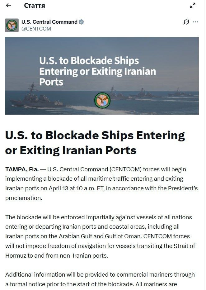 13 квітня о 10:00 США розпочнуть морську блокаду всіх суден, що заходять у іранські порти або виходять з них, — CENTCOM.