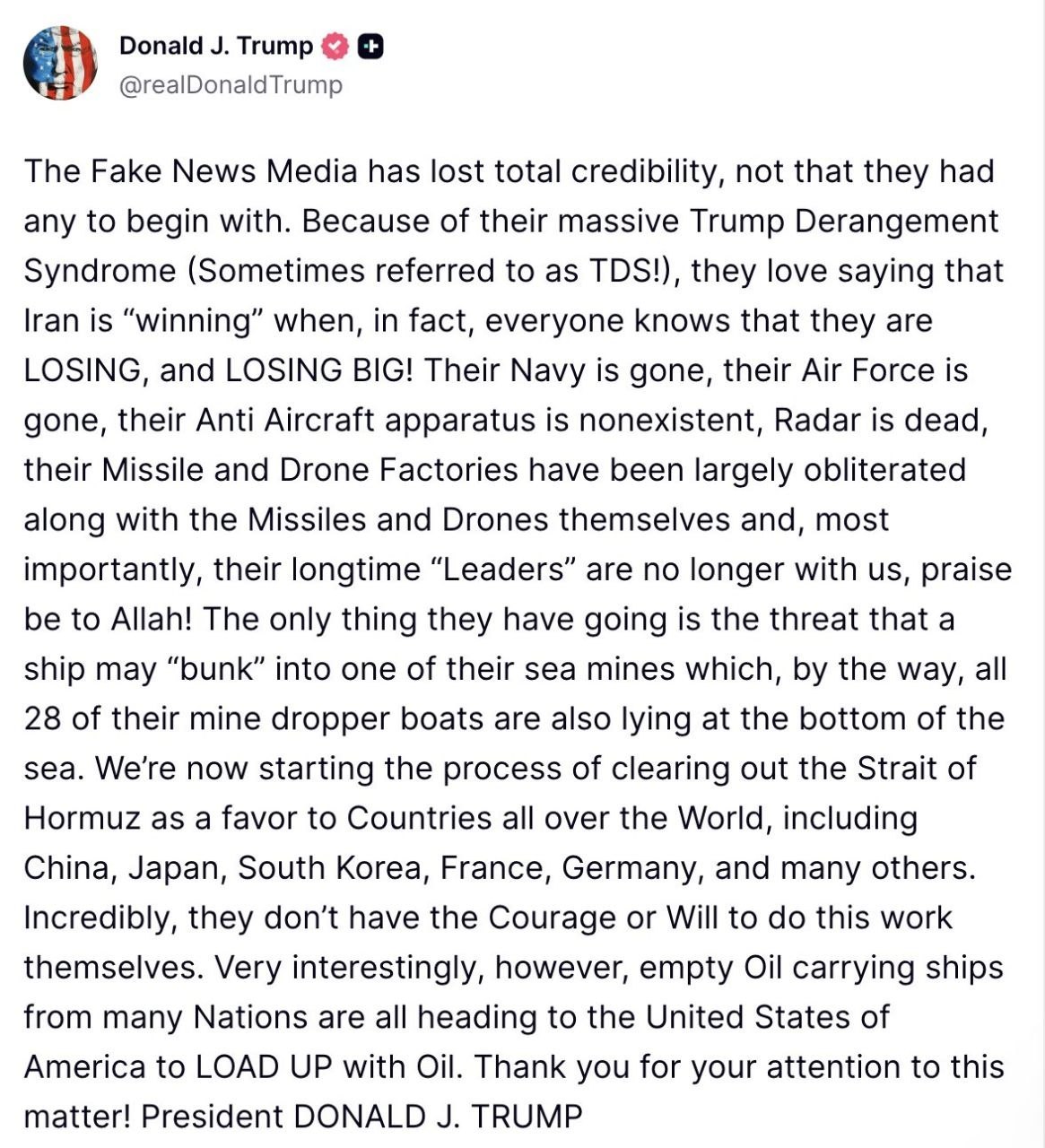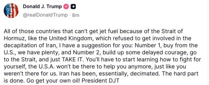 "Дивно, що вони не мають достатньо мужності чи волі, аби зробити це самостійно. Водночас цікаво, що порожні танкери багатьох держав зараз прямують саме до Сполучених Штатів, щоб завантажитися нафтою", — пише Трамп.