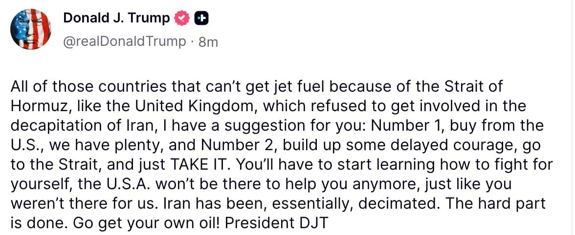 "Вам доведеться навчитися самим боротися за себе. США більше не будуть вам допомагати так, як ви не допомагали нам. Іран, по суті, знищений. Найскладніше вже зроблено. Ідіть і видобувайте свою власну нафту", — написав він у Truth Social.