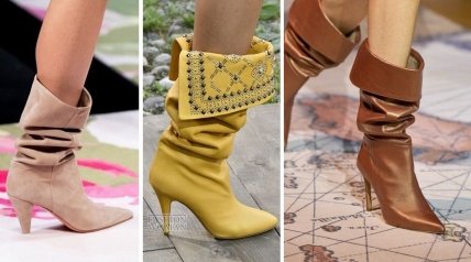 Весняні легкі моделі чобіт зі складками, які елегантно спадають до щиколоток, будуть у тренді цієї весни. Особливої елегантності такому взуттю додає невеликий грубий підбор. Чоботи відмінно підійдуть для образів із тренчами та весняними пальтами. Зупиніться на базових чорних та білих моделях чобіт із драпіруванням.