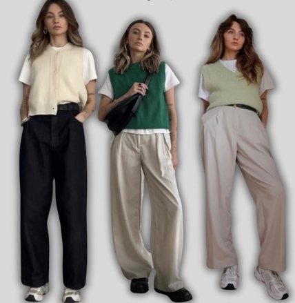 З брюками вільного крою. Це варіант повсякденного образу. Однак для того, щоб зробити свій аутфіт більш цікавим, жилет можна обрати яскравих або неординарних кольорів. Наприклад, зелений або навіть червоний. Ідеально доповнюється такий лук кросівками.