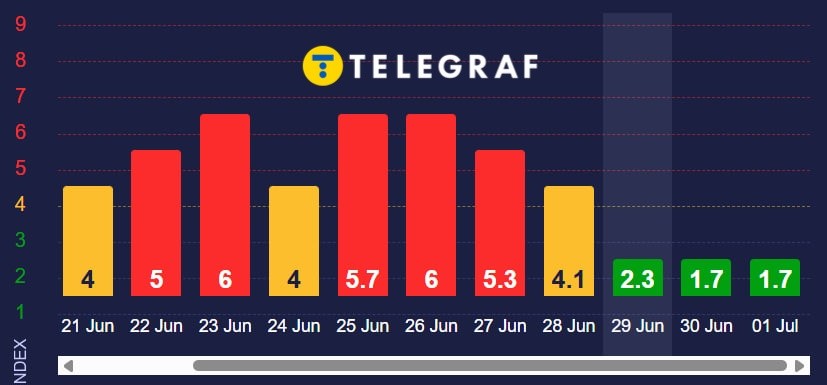 Згідно з оновленим графіком геомагнітних штормів на сайті Meteoagent, який складає свій прогноз на основі супутникових систем NOAA, TESIS і наукових міжнародних метеорологічних лабораторій по всьому світу, 29 червня тримається низька сонячна активність у 2,3 бала. Така геомагнітна погода прогнозується ще 30 червня та 1 липня.
