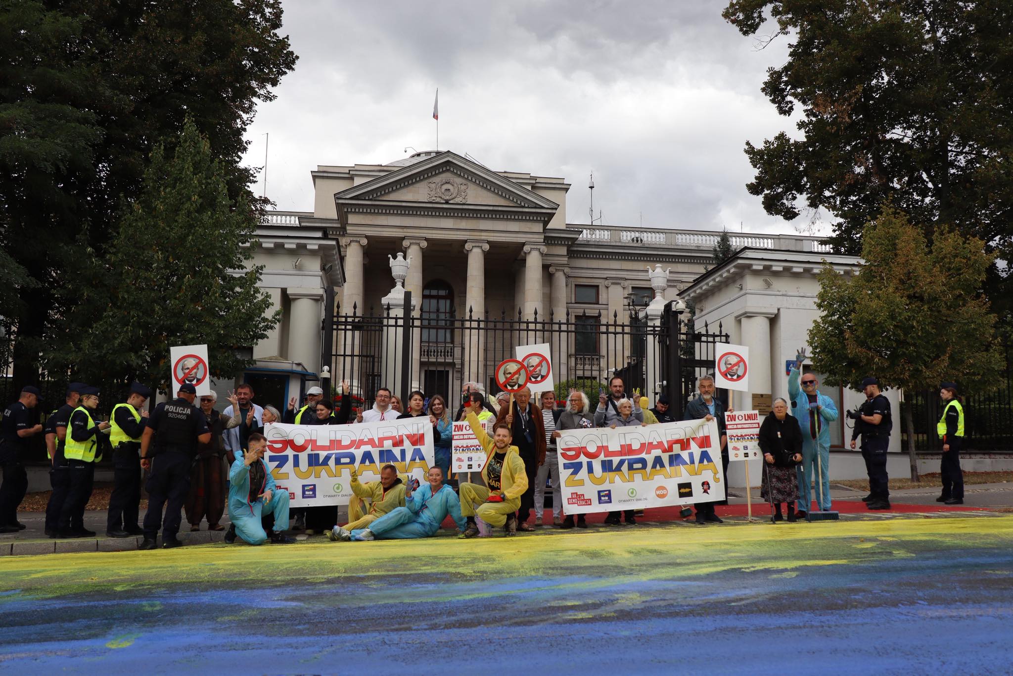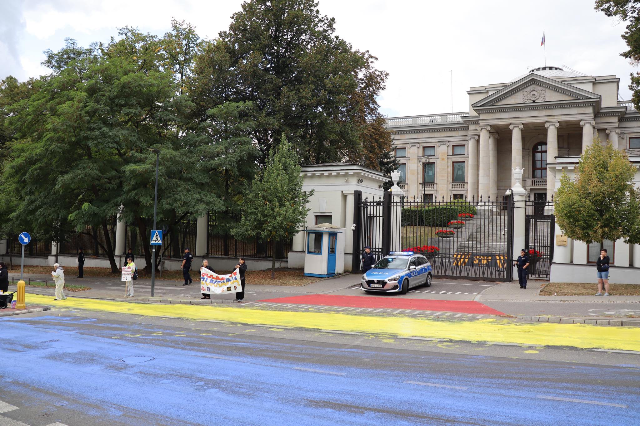 У Варшаві в Польщі на День прапора України активісти намалювали величезний стяг біля Посольства Росії. Блакитно-жовтий прапор з'явився на Алеї Жертв російської агресії.