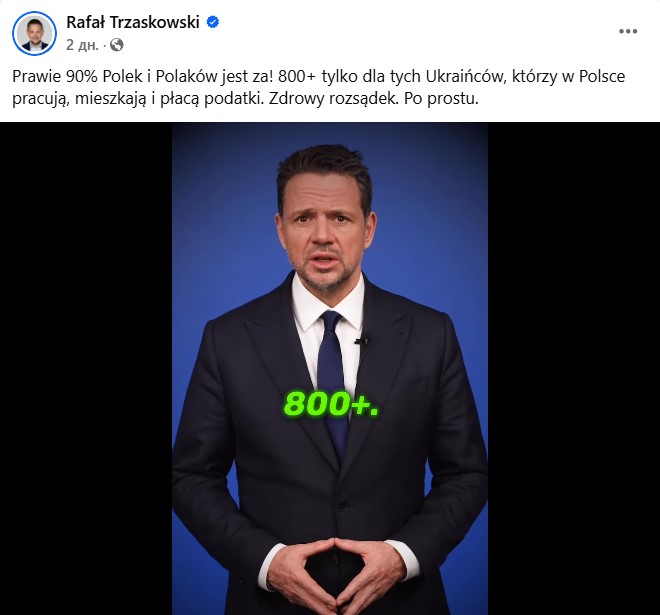 Та цього виявилось замало, й з'явилися нові ініціативи від польських політиків про згортання допомоги. Пролунали вони на фоні старту передвиборчої кампанії, адже 18 травня 2025 року в країні обиратимуть президента. Зокрема, мер Варшави Рафал Тшасковський – кандидат від правлячої партії "Громадянська коаліція" – під час зустрічей з виборцями наголошує на необхідності фундаментальних змін щодо виплат для українців. "Більшість українців в Польщі тяжко працюють. Тут вони живуть, тут платять податки, а їхні діти навчаються в польських школах. То абсолютно ясно, що вони повинні отримувати 800 плюс. Але ті, хто в Польщі не працюють, на 800 плюс не мають права. Це здоровий глузд. Просто хтось мав про це голосно заявити", – цей меседж Тшасковський транслює й через соціальні мережі.