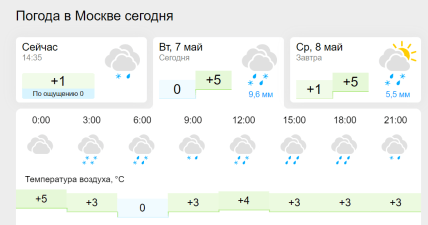 Відео травневого снігопаду публікують російські Telegram-канали. У ніч проти 7 травня температура в столиці РФ опускалася до мінус 0,4 градусів. За прогнозами синоптиків, така погода може зберегтися до 9 травня.