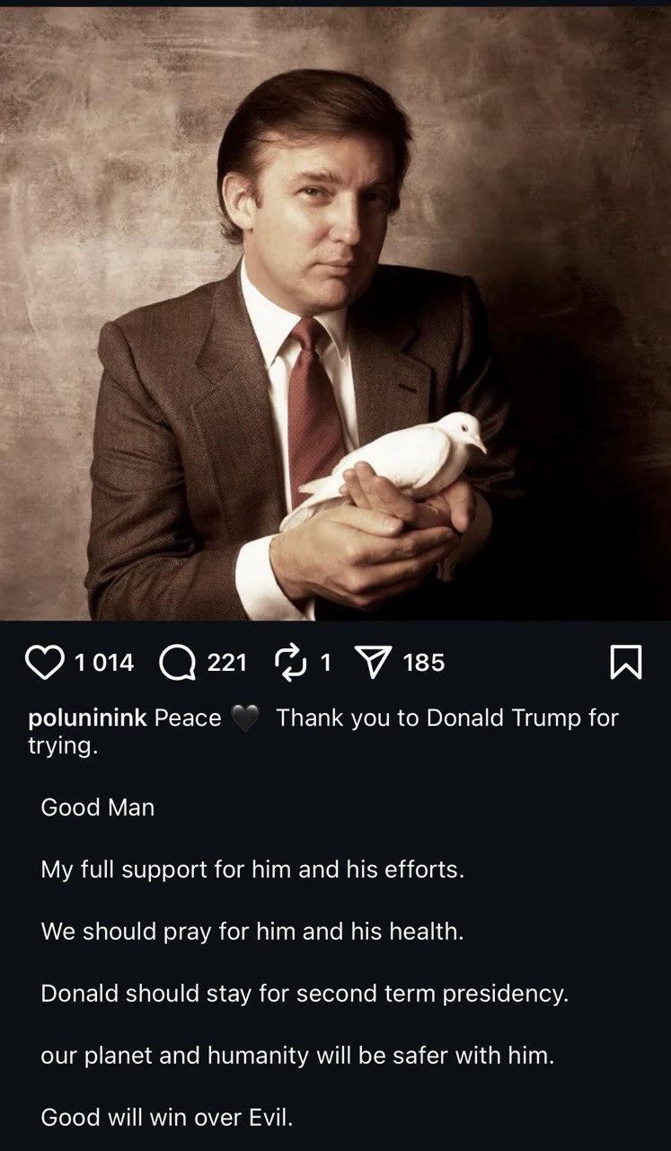 Полунін продовжує вважати Путіна "янголом" і публікує це у соцмережах. А тепер артист став підтримувати ще й Дональда Трампа, викладаючи його фото, і називаючи "суперсексуальним, найвеселішим і просто геніальним президентом". До слова, сторінка Полуніна в Інстаграм недоступна на території України.