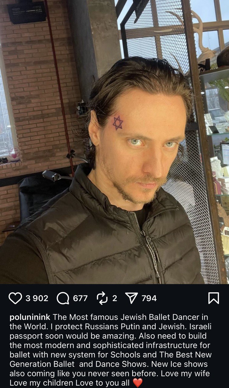 Відомо, що з Росії танцівник втік до Ізраїлю і заявив, що хотів би отримати громадяство цієї країни. Ба більше, у своєму дописі в Інстаграм він зазначив, що "захищає росіян, Путіна і євреїв". До слова, Полунін набив ще одне татуювання — цього разу на обличчі. На його скроні тепер є зірка Давида.