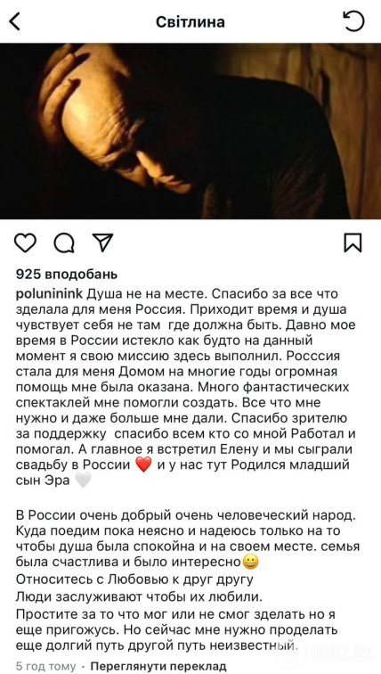Полунін повідомив, що його "місія" в РФ завершена, і він більше не відчуває себе там, як удома. Про це він розповів на своїй сторінці в Instagram. Відразу путініст не повідомив, куди саме поїде з родиною, але сказав, що туди, де "душа була б спокійна і на своєму місці".