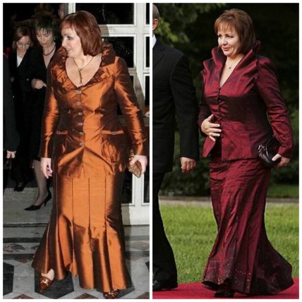 Путіна також виходила у світ у костюмах, пошитих з блискучих матеріалів, низької якості. До того ж вони додавали об'єму її пишній фігурі.