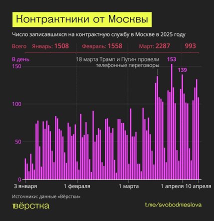 За інформацією джерел видання, сплеск інтересу до контрактної служби припав на період, коли з’явилися повідомлення про часткове відновлення контролю російських військ над прикордонними районами Курської області, а також на тлі обговорень можливих мирних переговорів між Росією та Україною. Додатковим поштовхом стала інформація про телефонну розмову Володимира Путіна та Дональда Трампа — після неї кількість "добровольців" досягла рекордних для 2025 року значень. На тлі чуток про можливі мирні домовленості з Україною, багато хто прагне "встигнути" підписати контракт — перш ніж війна завершиться.