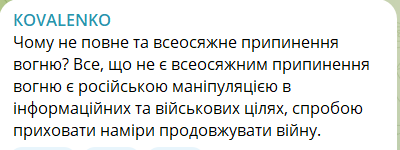 Андрій Коваленко, офіцер Сил оборони та керівник Центру протидії дезінформації РНБО, також висловив свою позицію щодо оголошеного Росією "перемир'я": "Чому не повне та всеосяжне припинення вогню? Все, що не є всеосяжним припинення вогню є російською маніпуляцією в інформаційних та військових цілях, спробою приховати наміри продовжувати війну".