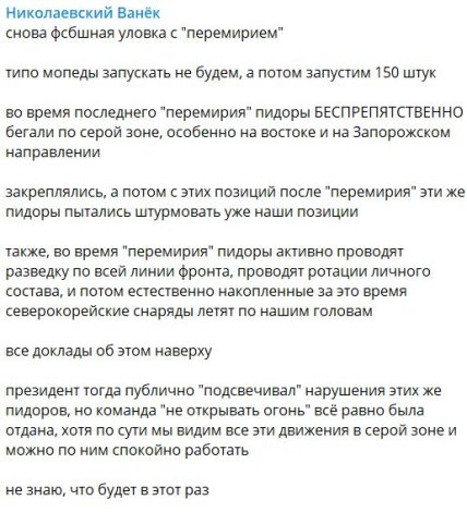 Автор моніторингового Telegram-каналу "Миколаївський Ванек" критично оцінює заяву Путіна, назвавши її "черговою фсбшною хитрістю": "Під час останнього 'перемир'я' окупанти безперешкодно пересувалися сірою зоною, особливо на сході і на Запорізькому напрямку. Вони закріплювалися, а потім із цих позицій після 'перемир'я' намагалися штурмувати вже наші позиції".